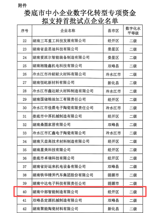 在娄底市工业和信息化局2025年9月24日公布的中小企业数字化转型首批试点企业名单,湖南中部智能制造有限公司凭借在人力资源、生产执行、仓储加工及订单服务四大领域的数字化创新实践成功入选。此次入选不仅是政府对企业转型成果的高度认可,更标志着公司在数字化建设的道路上迈出了里程碑式的一步。